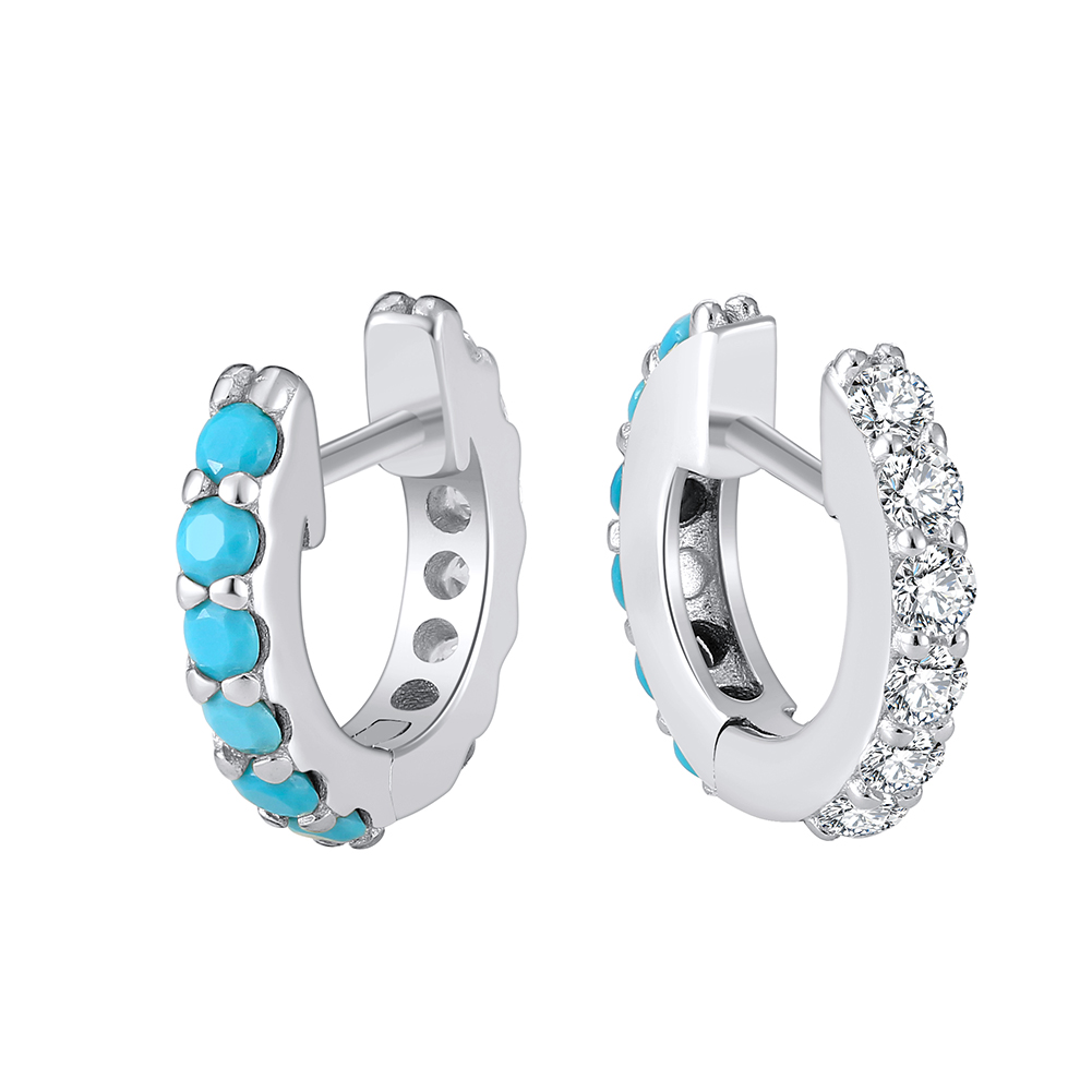 Mazi, divpusēji sudraba auskari, kurus rotā mirdzoši baltas un tirkīzkrāsas cirkoni, lieliski papildinās Jūsu tēlu.