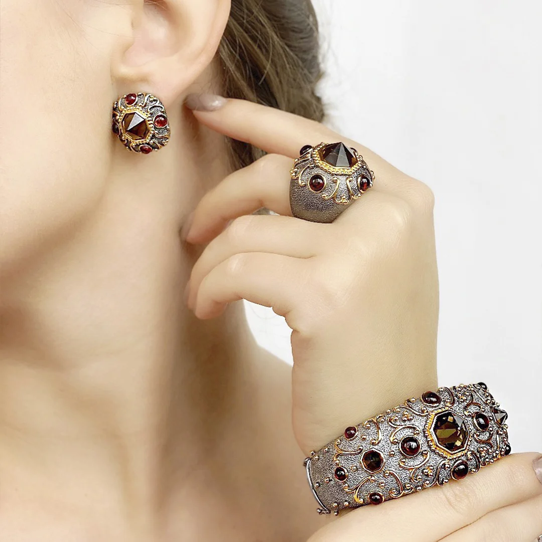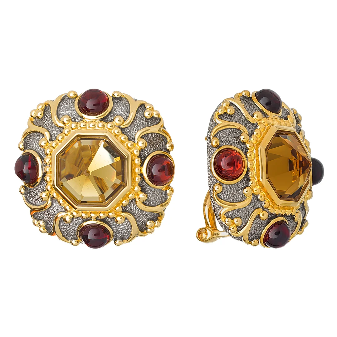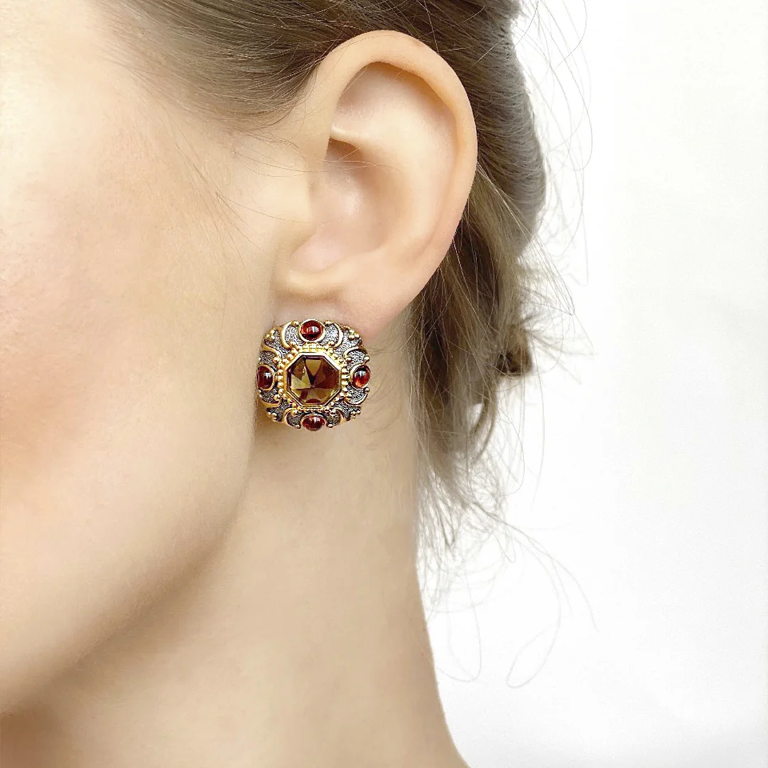 Konjaka krāsas kvarcs lieliski saskan ar tumši sarkano granātakmeni. Savukārt apzeltījums lieliski izceļ auskaru ornamentu un sudraba faktūru. Grezna dāvana īpašiem dzīves brīžiem.