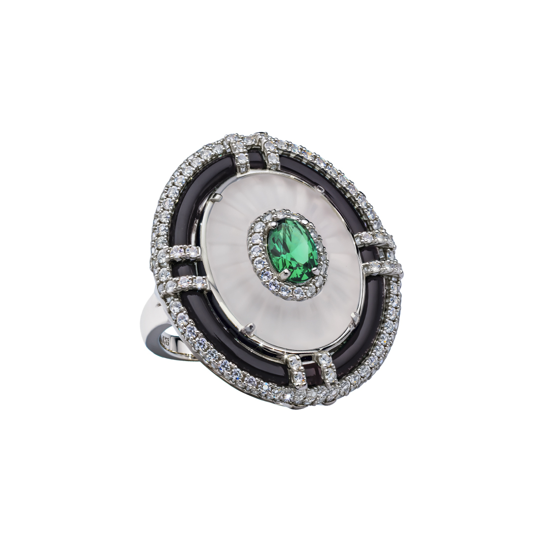 "Riviera" kolekcija iemieso Art Deco eleganci ar modernu pieskaņu. Katra rota, kas veidota no kalnu kristāla, baltā topāza, nano-smaragdiem un melnā ahāta, izstaro mūžīgu eleganci un izsmalcinātu skaistumu.