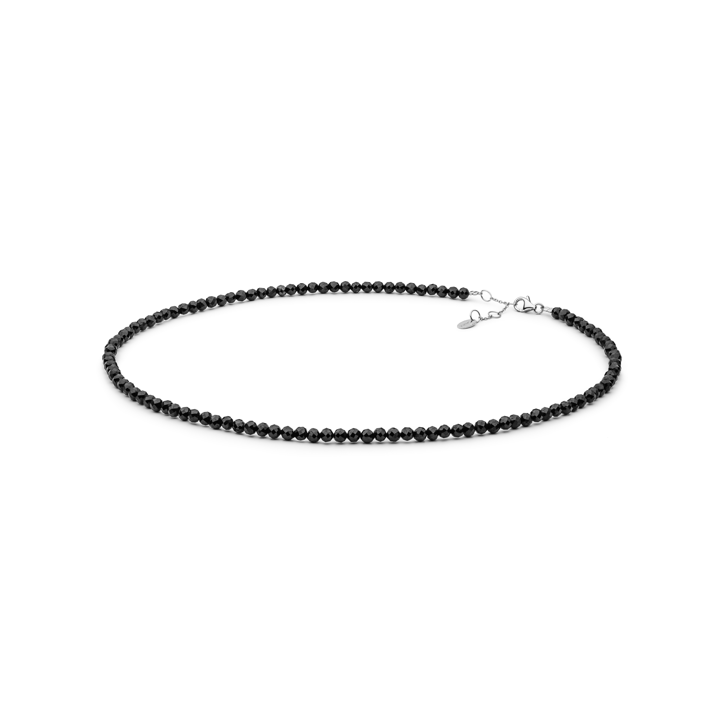 Smalka, askētiska kaklarota ar mirdzošajiem melniem špineļiem būs lieliska dāvana! Špineļu diametrs 4.0-4.5 mm.